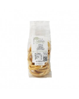 Prodotti dal Biscottificio Cirucci con le farine e l'olio extravergine di Via dei Contrabbandieri, questi taralli sono lavorati a mano e cotti al forno per 30 minuti a 200 C. L’aroma assolutamente caratteristico della farina semintegrale macinata a pietra di frumento Senatore Cappelli rende i taralli un prodotto di biscotteria salata di gran pregio.